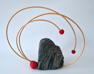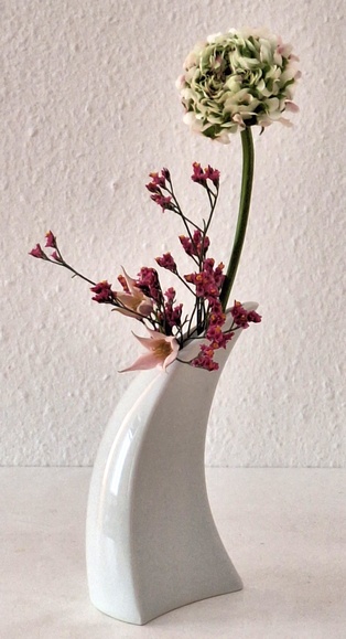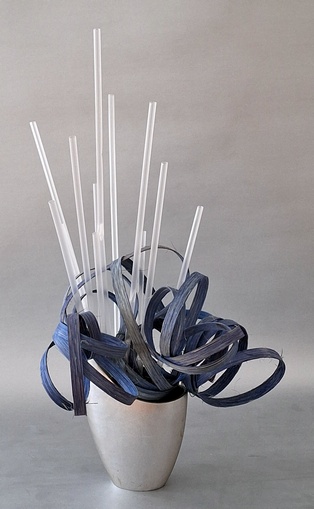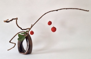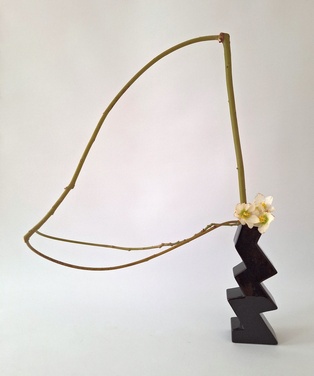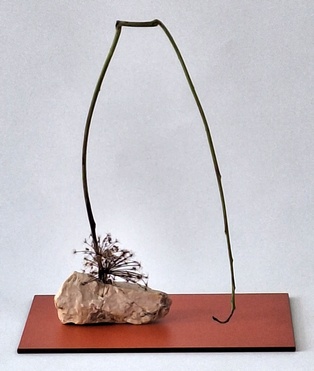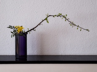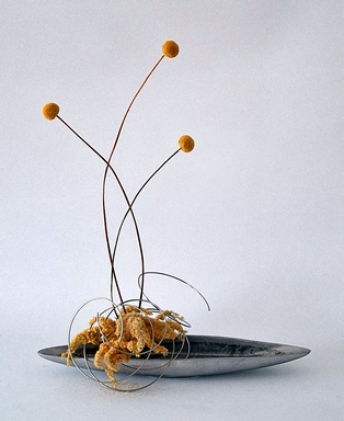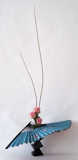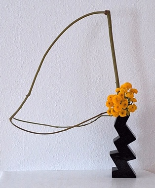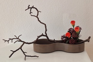 Bewegung Obwohl Ikebana ein statisches Kunstwerk ist, kann es Bewegung ausdrücken. Dies geschieht z.B. durch das Betonen von gebogenen Zweigen oder Stielen, gedrehten Drähten oder Blättern, die wie schwebend wirken. Frische Blumen ergänzen diese Elemente. Man kann sich auch als Thema ein Wort aussuchen, das Bewegung ausdrückt wie z.B. schweben, rollen, fließen, …