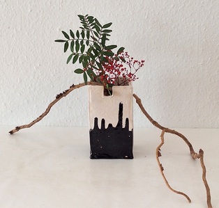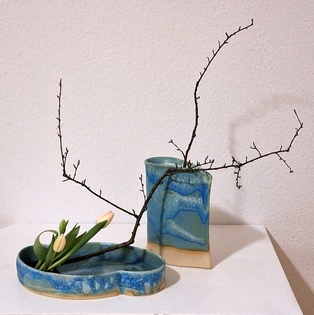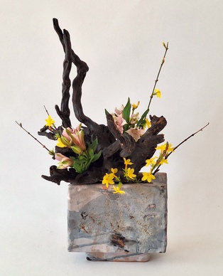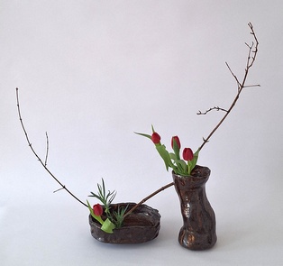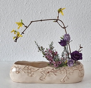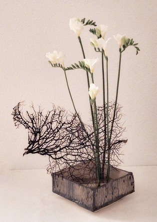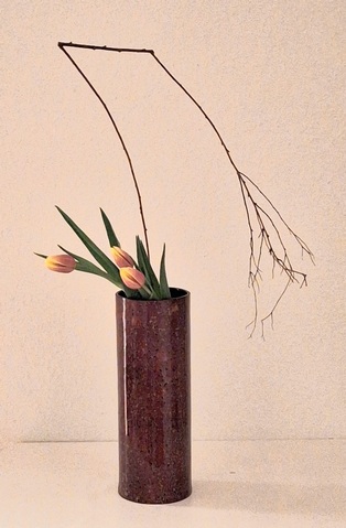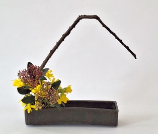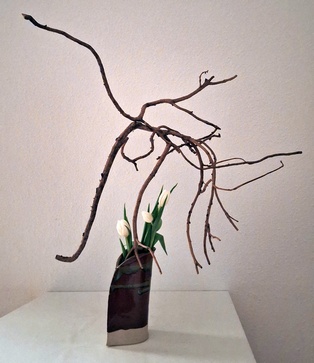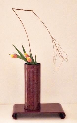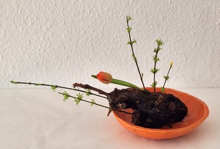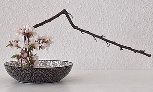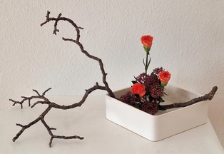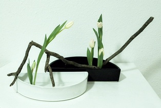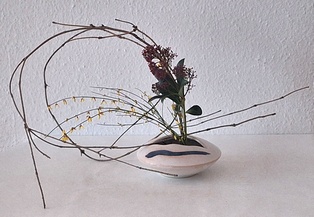 Komposition mit kahlen Zweigen Garyubai „schlafender Drache“, Tsutsunuki, der „durchstechende Zweig“, Mizukuguri, der „eintauchende Zweig“ In der kalten Jahreszeit bieten sich unbelaubte Zweige als Ikebana-Material an. Der Vorteil ist die gut erkennbare Wuchsform, die mit speziellen Arrangements zur Geltung gebracht werden kann. Ikebana mit kahlen Zweigen erinnert in seiner Wirkung an Kalligraphien. Dem Motiv Garyubai „schlafender Drache“, ist mit dem Pflaumenpark von Kameido in Tokyo verbunden. Bedeutende Künstler wie Utagawa Hiroshige (Zehn Ansichten von Edo, 1857) und Vincent van Gogh widmeten sich dem Motiv. Es besagt, dass ein umgefallener Baum frische Triebe bringt. Dies lässt sich in Ikebana darstellen, wenn aus einem knorrigen Ast oder starkem, trockenem Holz mehrere junge Zweige herauswachsen. Tsutsunuki, der „durchstechende Zweig“, ist eine optische Täuschung bei Nageire. Er liegt an der äußeren Gefäßwand an, setzt sich unsichtbar im Gefäß fort und erscheint wieder auf der gegenüberliegenden Seite. Das symbolisiert die Kraft der Pflanze und verweist auf den kommenden Frühling. Bei Mizukuguri, taucht der im Kenzan befestigte Zweig in das Wasser ein und strebt wieder in die Höhe. Für diese Arbeit im Moribana-Stil wird eine größere Schale benötigt. Tsutsunuki und Mizukuguri sind bereits in klassischen Schulen bekannt und ebenso im modernen Ikebana interessant. Eine Kombination von Schale und Vase wirkt attraktiv.