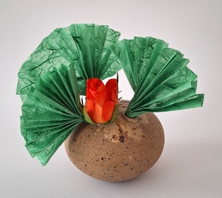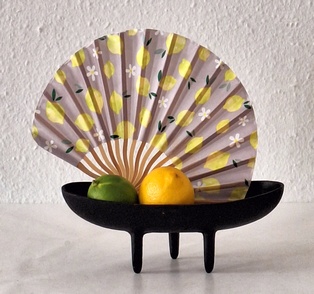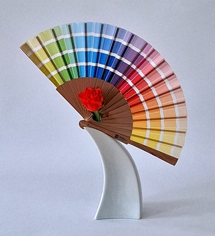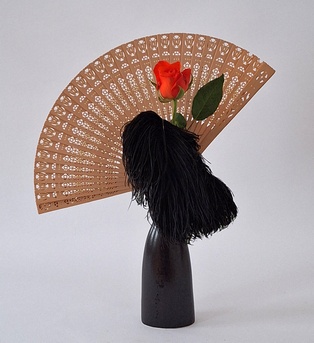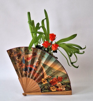 Fächer Zum Höhepunkt des Faschings, dem Wiener Opernball, passt das Kursthema „Fächer“. Diese waren in Europa seit der Barockzeit in den oberen Gesellschaftsschichten weit verbreitet, es gab sogar eine eigene „Fächersprache“ und „Fächerakademien“. Die Accessoires der Ballkultur waren aus kostbarem Material: Rippen aus geschnitztem Elfenbein, Perlmutt, Schildpatt, Horn sowie bestickte Seide und künstlerisch bemaltes oder bedrucktes Papier für das Fächerblatt. Ende des 19. Jahrhunderts kamen Faltfächer aus Spitze und (Straußen-) federn in Mode. In Japan zählt das Motiv des Fächers (Ogi) zu den beliebtesten Motiven in der Kunst. Faltfächer und Blattfächer waren seit dem 7. Jahrhundert Gegenstand der höfischen Etikette. Herrscher verwendeten Befehlsfächer (Gunbai) wie einen Kommandostab. Adelige erfanden als Zeitvertreib ein Spiel, bei dem sie bunte Fächer in Wasserläufe warfen. Das Motiv der „fliegenden Fächer“ findet sich bis heute auf Kimonos und kunsthandwerklichen Objekten. Fächer lassen sich in Ikebana gut darstellen. So ähneln Bergenienblätter dem „Sommerfächer“, der nur auf einer Seite bemalt und nicht zusammenlegbar gestaltet ist. Blätter der Fächerpalme können frisch, getrocknet, gefärbt … verwendet werden. Ebenso ist es möglich, historische oder moderne, auch selbst gemachte, Fächer in das Arrangement zu integrieren. Es gibt Gefäße und Unterlagen in Fächerform.