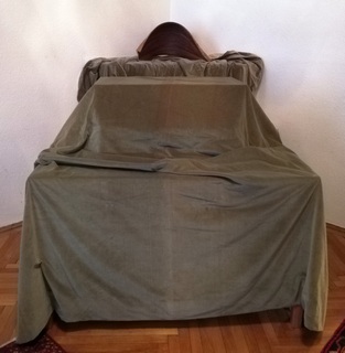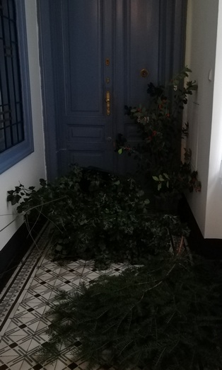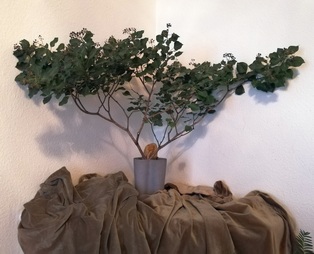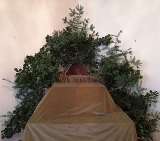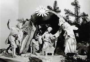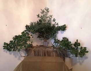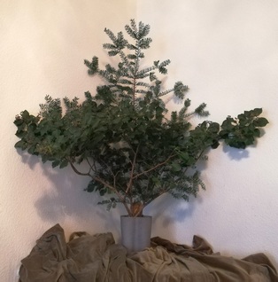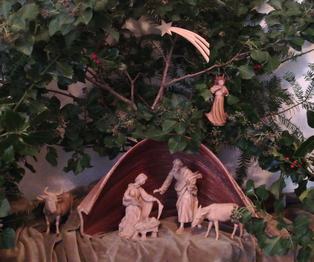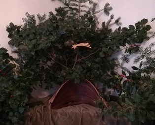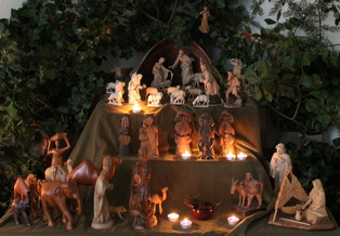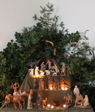 Unsere Familienkrippe ist 60 Jahre alt. Die Kerngruppe wurde in Tirol geschnitzt. Von Jahr zu Jahr kamen neue Figuren dazu: Schafe vom Attersee, Hirten aus Tschechien, Musikanten aus Polen oder die drei Könige aus dem Heiligen Land. Es ist unser Brauch, die größer werdende Krippenlandschaft jedes Jahr ähnlich, aber doch immer etwas anders aufzubauen: Mit Wurzeln und Hölzern, Moos, Wacholder, Drehweide ... und 2020 mit Efeu, Eibe und Ilex. Seit einigen Jahren hat sie ihren festen Platz auf dem unbenützten Dauerbrandofen in der Wohnzimmerecke gefunden. Zuerst wird Material aus dem Garten geholt, das Mobiliar - Tisch, Treppchen, Blumentische - aufgestellt und mit Samt verkleidet. In Vasen kommen Nageire-Befestigungen, evtl. Steine zum Stabilisieren und die dann Pflanzen. Um einen weihnachtlichen Eindruck zu erzielen, ergänzen Koniferen und Ilex mit den roten Beeren die immergrünen Efeuzweige. Über der Krippe schweben der Komet und ein Engel. Die oberste Stufe nehmen die Figuren der Heiligen Familie (diesmal in einem Palmenblatt), Ochs und Esel ein. Ihnen nähern sich Hirten mit ihren Schafen und typische Salzkammergut-Figurengruppen, wie "Mutter lass mich auch mitgehen". Unterhalb befinden sich die Musikanten. Von Osten nähern sich Kaspar, Melchior und Balthasar mit orientalischen Tieren sowie zwei Frauen. Gegenüber haben weitere "Urlaubssouvenirs" Platz gefunden.